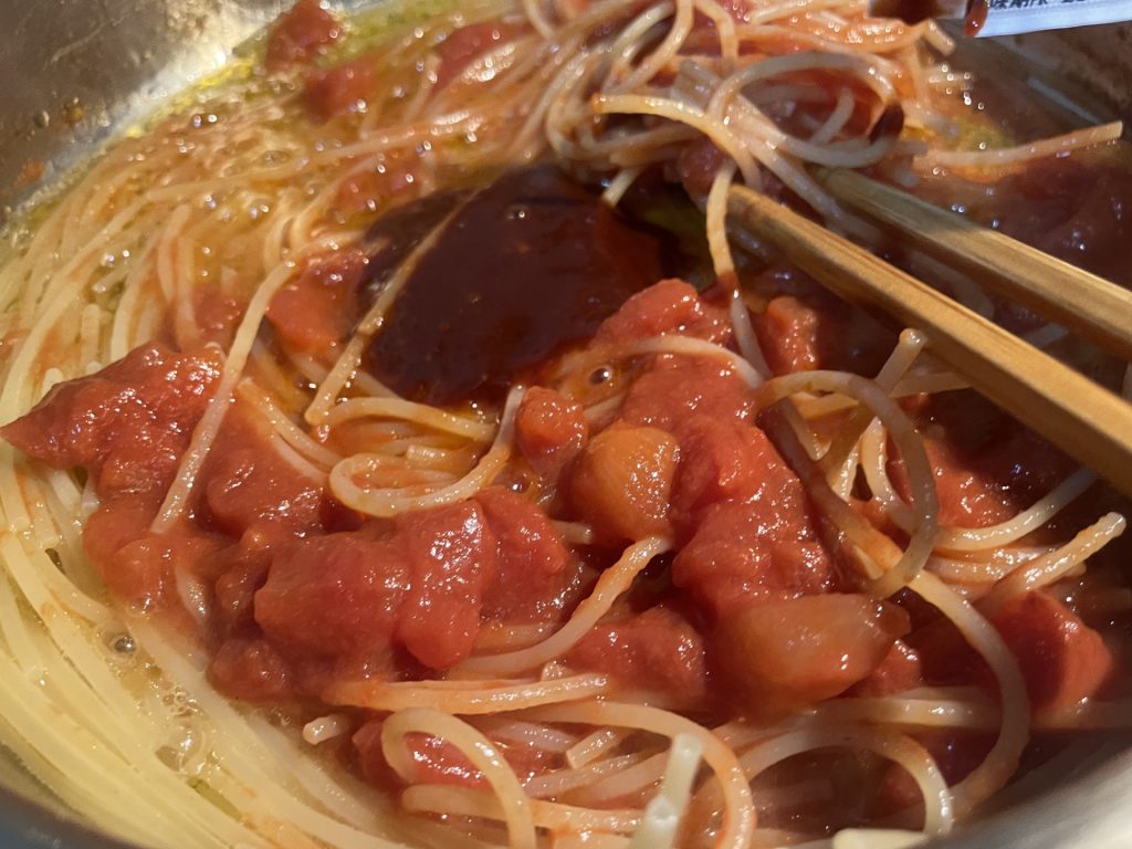 5分茹でたらオリーブオイル大さじ3、トマト缶、素を加えてさらに5分煮詰める。